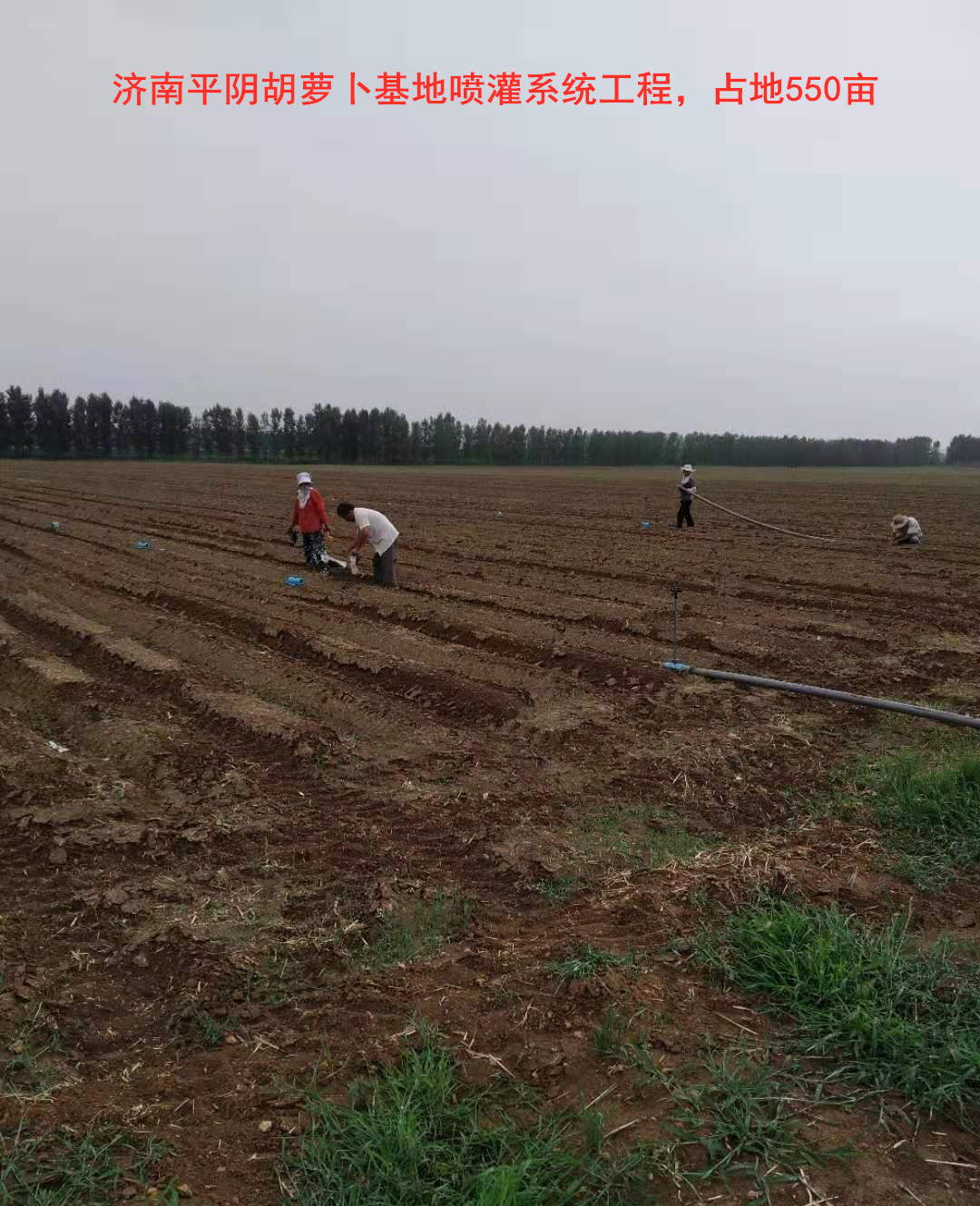 濟南海升水果胡蘿卜基地項目,總麵積為550畝,采用噴灌的灌溉方式,並運用草莓视频免费黄色自主研發的可回收噴灌配件,在胡蘿卜收獲季節可以拆卸,方便胡蘿卜的采摘和運輸,需要時經過簡單的組裝又可以實現噴灌功能,得到了用戶的認可和好評!