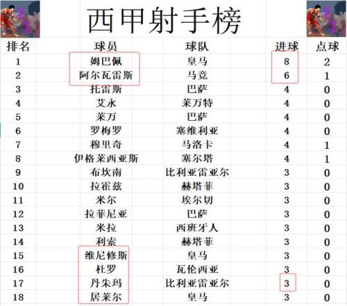 射手榜方麵,姆巴佩8球領跑,阿爾瓦雷斯6球位列第2,托雷斯,萊萬,穆裏奇,伊格萊西亞斯等人4球檳榔第3。丹朱瑪破門,失點無緣雙響,他就隻能追上維尼修斯,拉菲尼亞等人3球剛好擠入前十。
