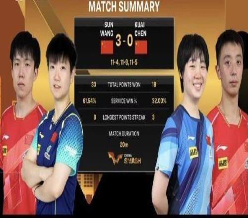 2025年WTT中國大滿貫混雙1/4決賽,王楚欽/孫穎莎以3比0(11比4、11比9、11比5)戰勝隊友陳垣宇/蒯曼,晉級四強。王楚欽/孫穎莎半決賽的對手是巴西組合雨果/高橋·布魯娜。