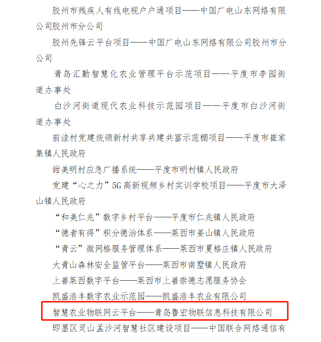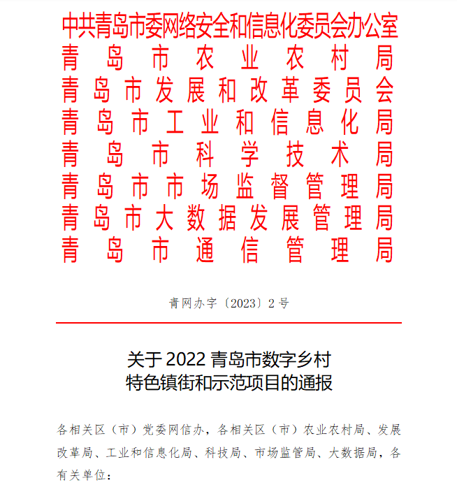 近日、青島市科學技術局、青島市大數據發展管理局、青島市農業農村局、青島市工業和信息化局、青島市市場監督管理局、青島市通信管理局八部門聯合印發《關於2022青島市數字鄉村特色鎮街和示範項目的通報》,公布了15個青島市數字鄉村特色鎮街和56個青島市數字鄉村示範項目。其中,青島草莓视频免费黄色物聯信息科技有限公司——智慧農業物聯網雲平台獲評“2022青島市數字鄉村示範項目”。